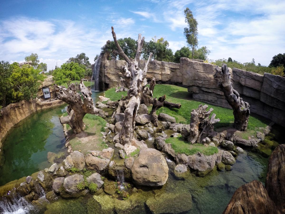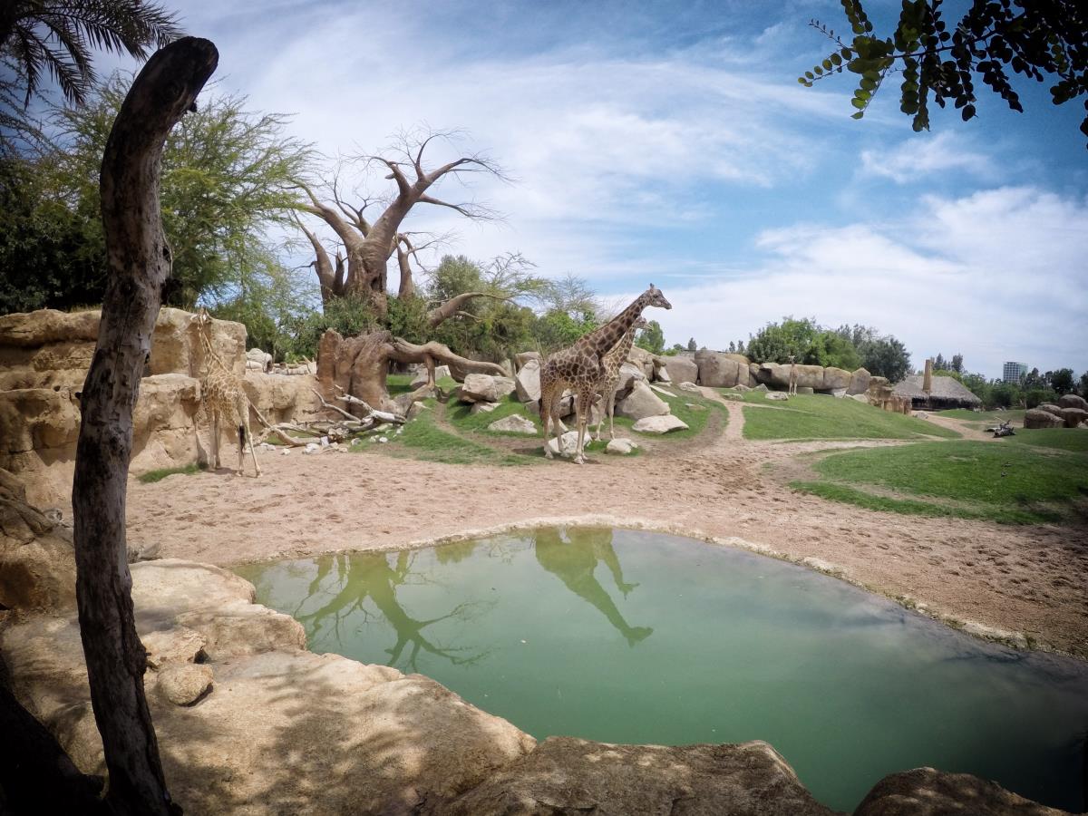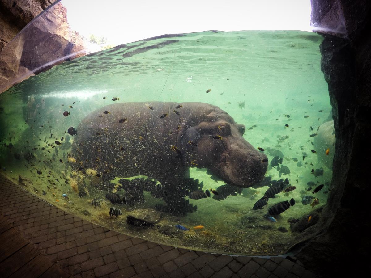 Zuvor habe ich noch nie ein Nilpferd auf so eine kleine Entfernung gesehen und ich wusste auch nicht, dass sie dann doch etwas schneller schwimmen können. Ich dachte immer die wären etwas träge 😉 Weit gefehlt… Auch die Elefanten- und Giraffenanlage war wunderschön. Erstaunlich ist, dass die Tiere sich nicht in die letzte Ecke verkrümmeln, wie sonst üblich, sondern in der Tat nur ein paar Meter entfernt waren 🙂 Da hatte ich dann selbst Chancen mit der goPro 🙂