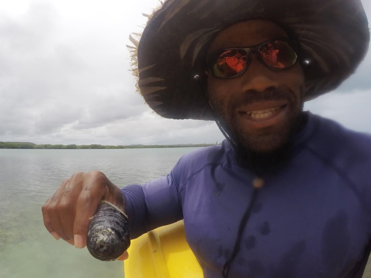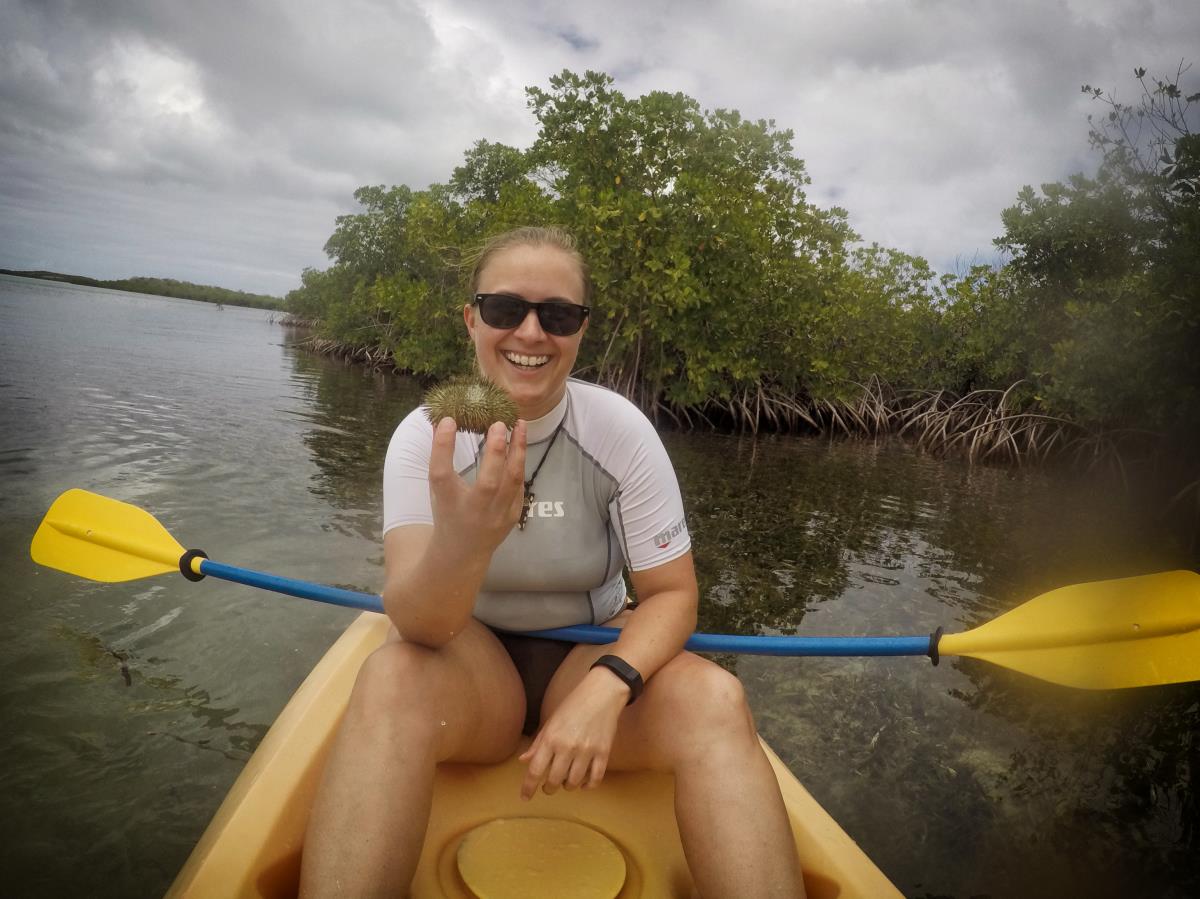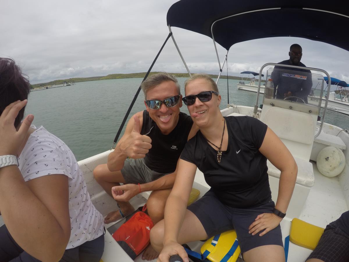 Unser Guide war echt klasse. Er erklärte viel zu den Mangrovenwäldern und wieviel Schutz man doch bei Stürmen darin finden kann. Wie man alle Arten unterscheiden kann… und er holte uns auch allerhand Tiere an die Oberfläche 🙂 Neben Seeigeln, Seesternen und einem kleinen glibber „Ding“, wo ich leider den Namen nicht mehr weiß, war so ziemlich am Ende der kleine Kugelfisch. Nach der Kajakfahrt waren wir nämlich noch auf einer super kleinen süßen und vor allen Dingen ruhigen Insel, fast ganz allein, und konnten wieder einmal die 30 Grad genießen, die Seele baumeln lassen und einfach mal die Füße hochlegen. Karibik kann so schön sein …………